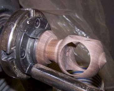With the blank gripped by the top I can proceed to turn to the final shape. I have full access to the bottom so I can turn it completely round or add a decorative point if I feel I may have bored the centerpiece mounting hole a bit too deep to allow making the bottom fully round. The intersecting holes were bored closer to this end of the blank so that I have better access between the chuck and the top of the ornament for the final cuts and sanding.