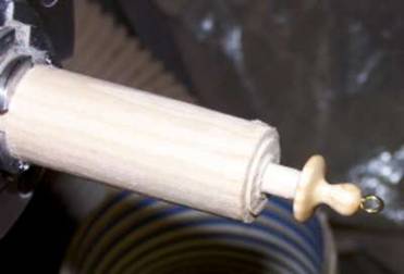 I usually use maple for the top finial and centerpiece, but I happened to have a scrap of white ash handy so I used it for this one. The blank started out 4” long and about ¾” square. I gripped one end in the chuck and used the tailstock for support while I roughed it down to round and cut a tenon on the end. I then mounted it by gripping the tenon in the chuck and completed the roughing out. I then turned a small finial with a ¼” tenon on the end of the piece and installed a screw eye for hanging.