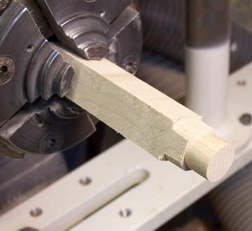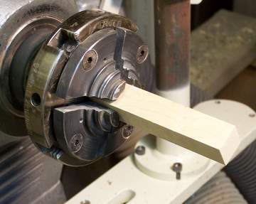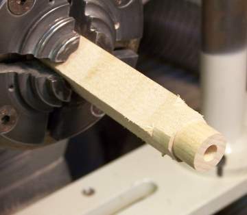One variation on the ornament is to add a bottom finial. Here I have mounted a 4" long piece of maple stock that has been milled to 5/8" square.