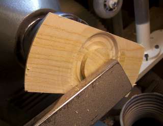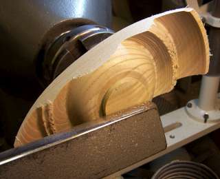 I reversed the box on the chuck again, gripping it by expanding the chuck jaws into the lid rebate. I can now start to shape the underside of the box. The key to doing a good job here is to not get too far ahead with the waste removal. I need to leave a good thickness of material in the middle of the arch until I have the extreme ends cut to the final thickness that I want.