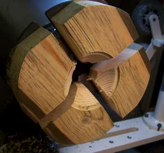 Now I need to figure out a way to mount the lid to allow finish turning the underside without marring the finished top side. I chose to mount some fresh pieces of wood to my Oneway Flat Jaws to allow turning custom jaws. I grabbed a piece of 2x6 and cut 4 squares, then screwed them to the chuck jaws. I then mounted the chuck on the lathe and dressed the face of the wooden squares flat. I also knocked off the corners.