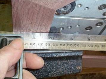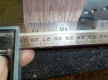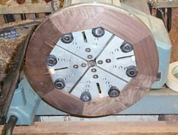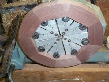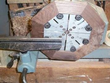 When I mounted the ½” thick rings to the chuck I found that the dogs stuck out too far and interfered with being able to dress the face of the rings. I taped some shims to the back of the octagons so that they stood out a bit from the face of the chuck and the dogs were no longer in the way. Two thicknesses of Popsicle sticks was just right. I dressed the faces and knocked off the corners just the same as the thicker rings.