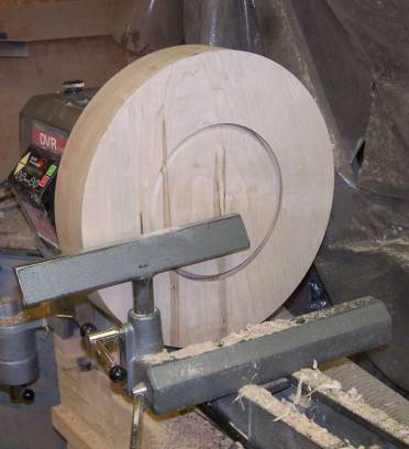It has been my experience that no matter how “dry” a thick piece of wood like this is there will still be some moisture gradient between the outer surfaces and the inside. On the first one of these I made the solid disk developed two very deep checks before I was ready for finish turning, so on this one I coated the freshly exposed surfaces with end sealer right after this picture was taken.