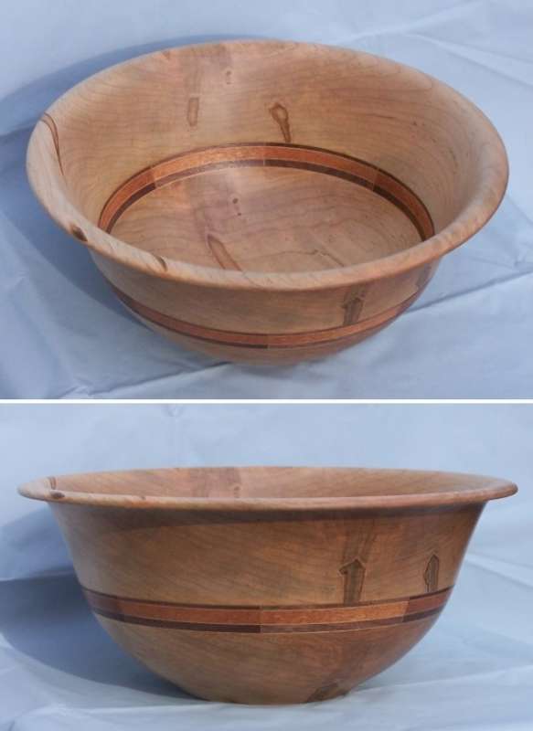 I reversed the bowl on the chuck and turned, sanded and finished the inside, then mounted it on my vacuum chuck to remove the tenon and finish turn the base. The completed bowl measures about 14 ¼” in diameter and stands 6” high.