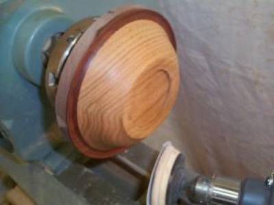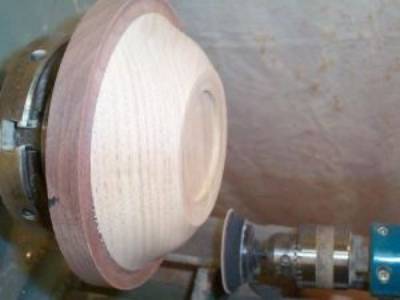 The bottom part of the potpourri is now mounted onto the screw chuck in preparation for turning the outside bottom surface.
