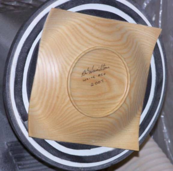 The tenon has been removed and the bottom sanded and finished. The plate is now complete. Total elapsed time from deciding I was going to make this project to completion was about an hour and a half, during which time I also managed to snap 90 photos to ensure I had some useable ones. It has taken more than twice that long to edit the photos and put together this write-up.