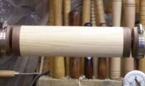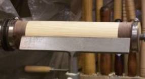 With the piece once again mounted between centres I return to the roughing gouge and bring it back down to round. I measure and mark the parting lines on the end caps to leave a wall thickness of about 3/8” on the ends of the case.