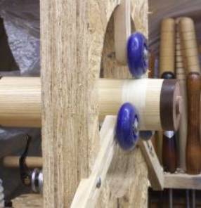 Now it is time for the steady rest. It would probably be a really good idea to put it on and get it adjusted while the piece is still firmly held between centres. Wish I had thought of it. I wrapped masking tape around the case where the steady rest wheels will ride both to protect the finish and to hold the case together once the waste with the hose clamp is cut off. I sawed through the last inch of the waste and set up my steady rest for support.