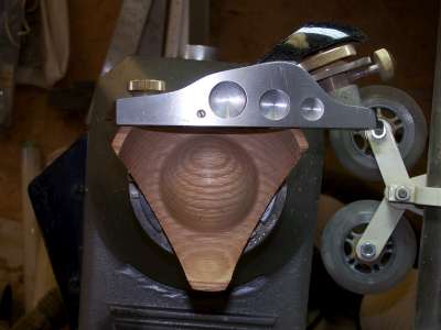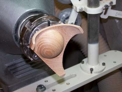 Once the shaping was complete I locked the headstock spindle with the long grain edge on top and used a block plane to plane away the chipped out edge. On this one that left one foot a bit wider than the others because the chip out was so deep. I then sanded the bottom of the piece. I was able to power sand the bottom of the candle cup but the underside of the legs is definitely a hand sanding operation.